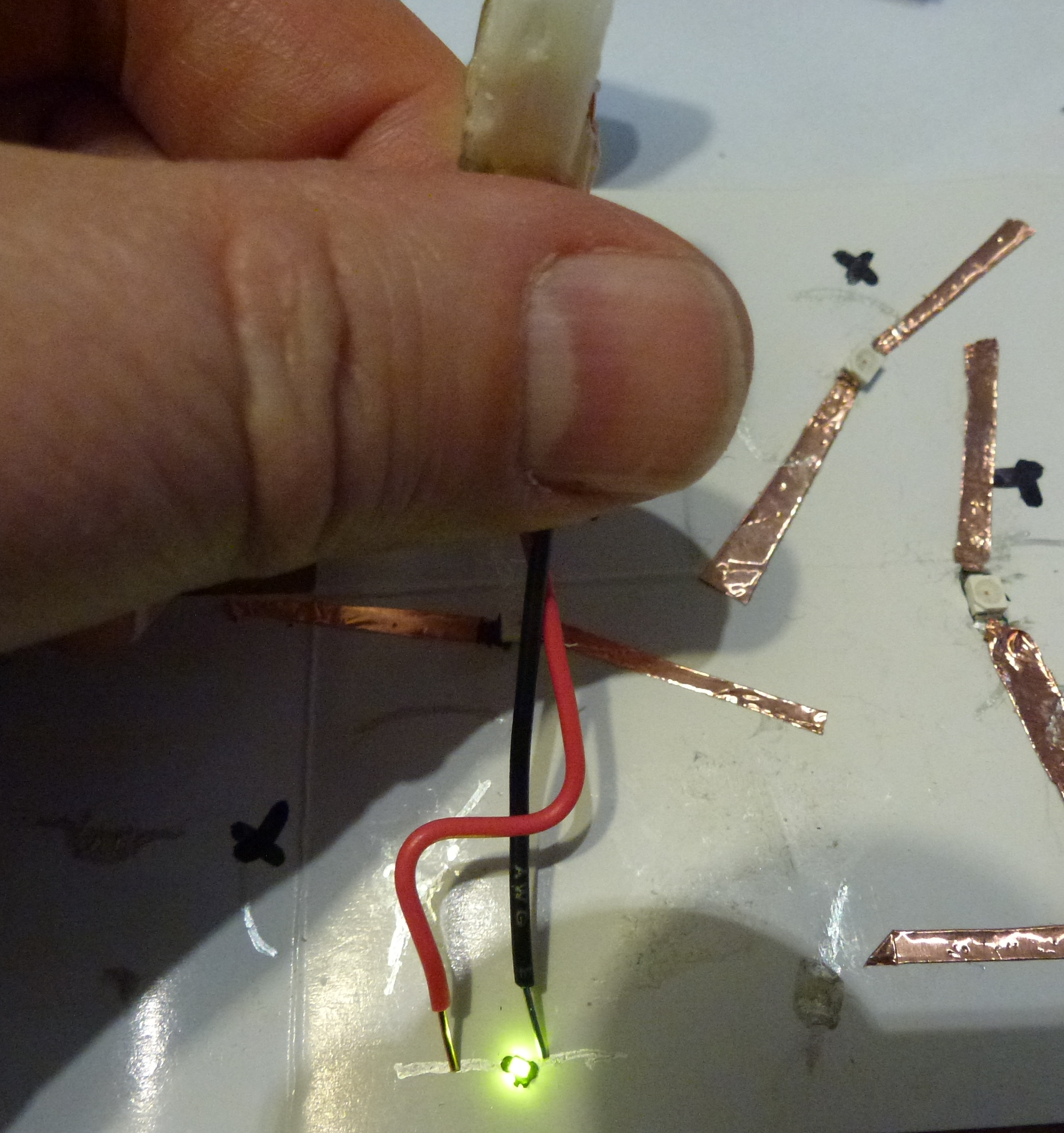 I knew those clip-on magnifiers were good for something other than soldering. That’s an 0603 surface mount LED, held down by wire glue. The traces are silver conductive ink, and those huge-looking red and black conductors are 22-gauge hookup wire. Here’s a wider view: