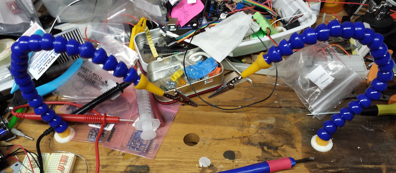 But by some chance of avarice a pile of articulated coolant pipes, aka “third hand” arms, showed up on my doorstep this holiday season. A couple of measurements and the world’s shortest openscad design session later, I was printing up a collar to mate the pipe fitting on the end of the arms to the dog holes. Then I mashed the alligator clips from my existing (much loved, much hated) third hand tool so they would fit into the nozzles, and presto.