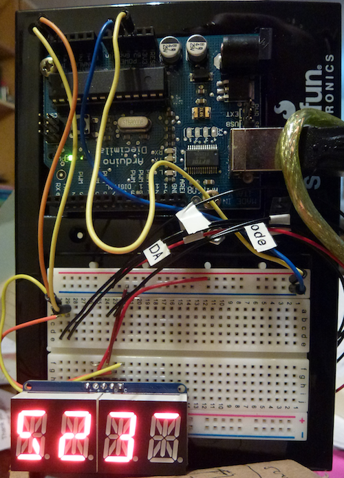 My first Arduino, stuck down on a ding&dent Sparkfun protoboard holder, with an Adafruit quad alphanumeric backpack wired in by I2C.